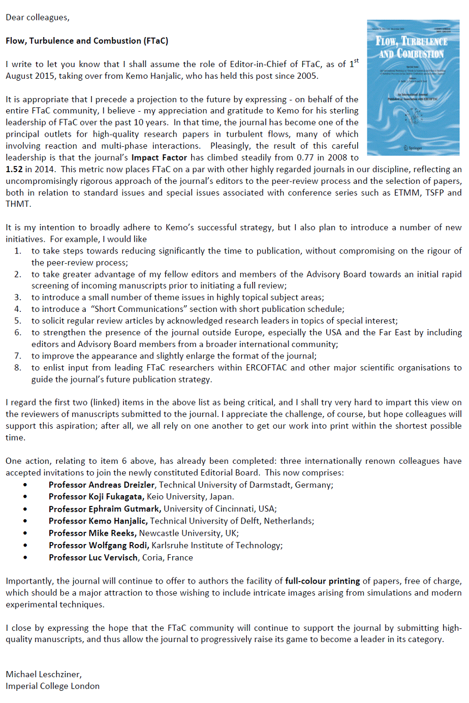 | ç§äº‹ã§ã™ãŒã€ã“ã®8/1付ã§Springer社発行ã®å›½éš›èªŒ Flow, Turbulence and Combustion (FTaC) ã®Editorã«å°±ä»»ã™ã‚‹ã“ã¨ã«ãªã‚Šã¾ã—ãŸã€‚ |